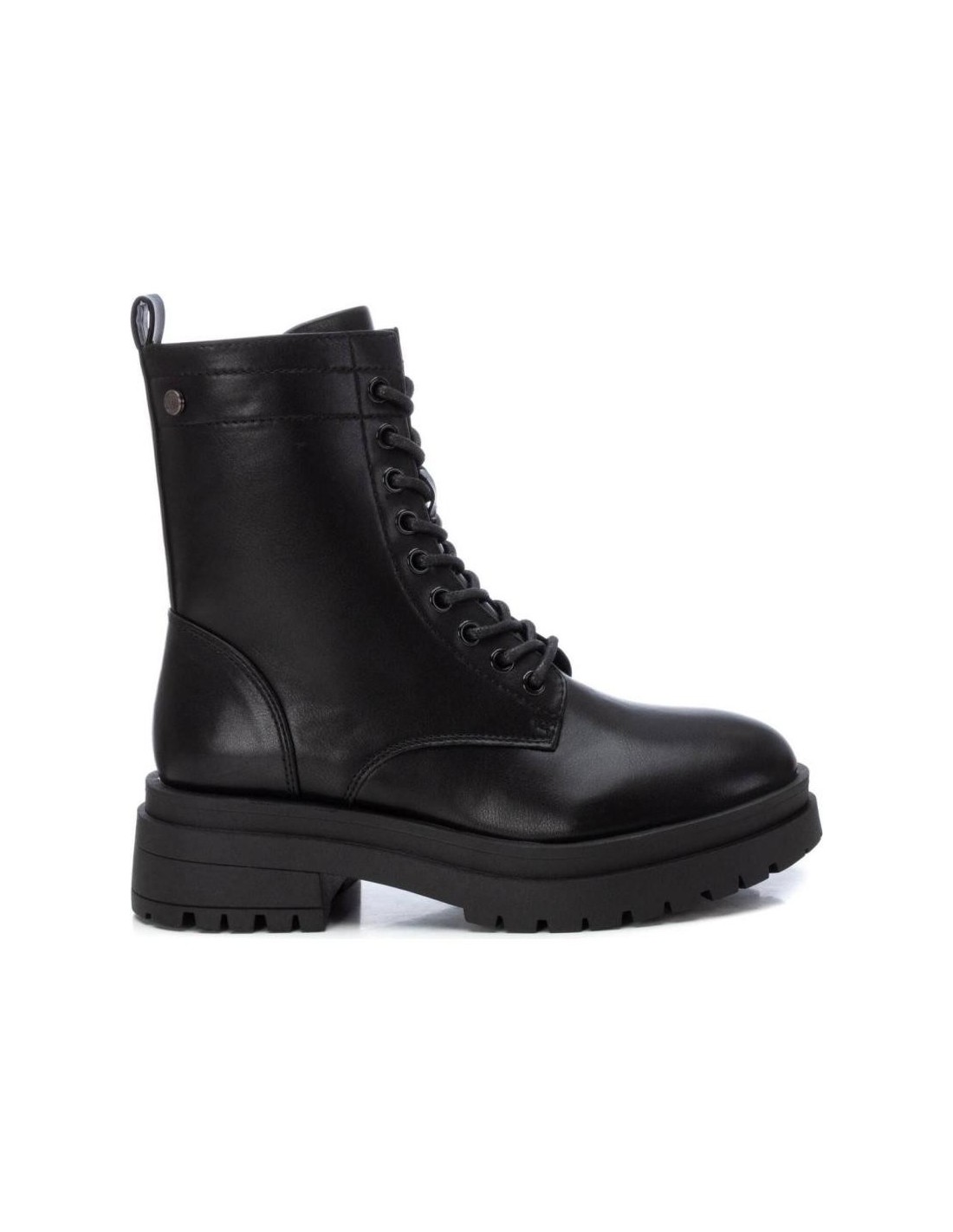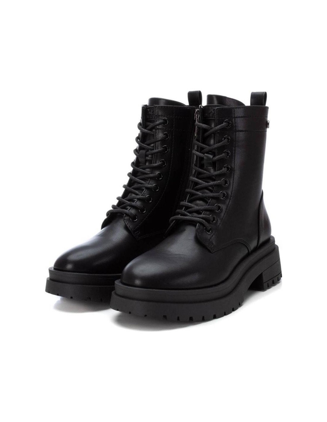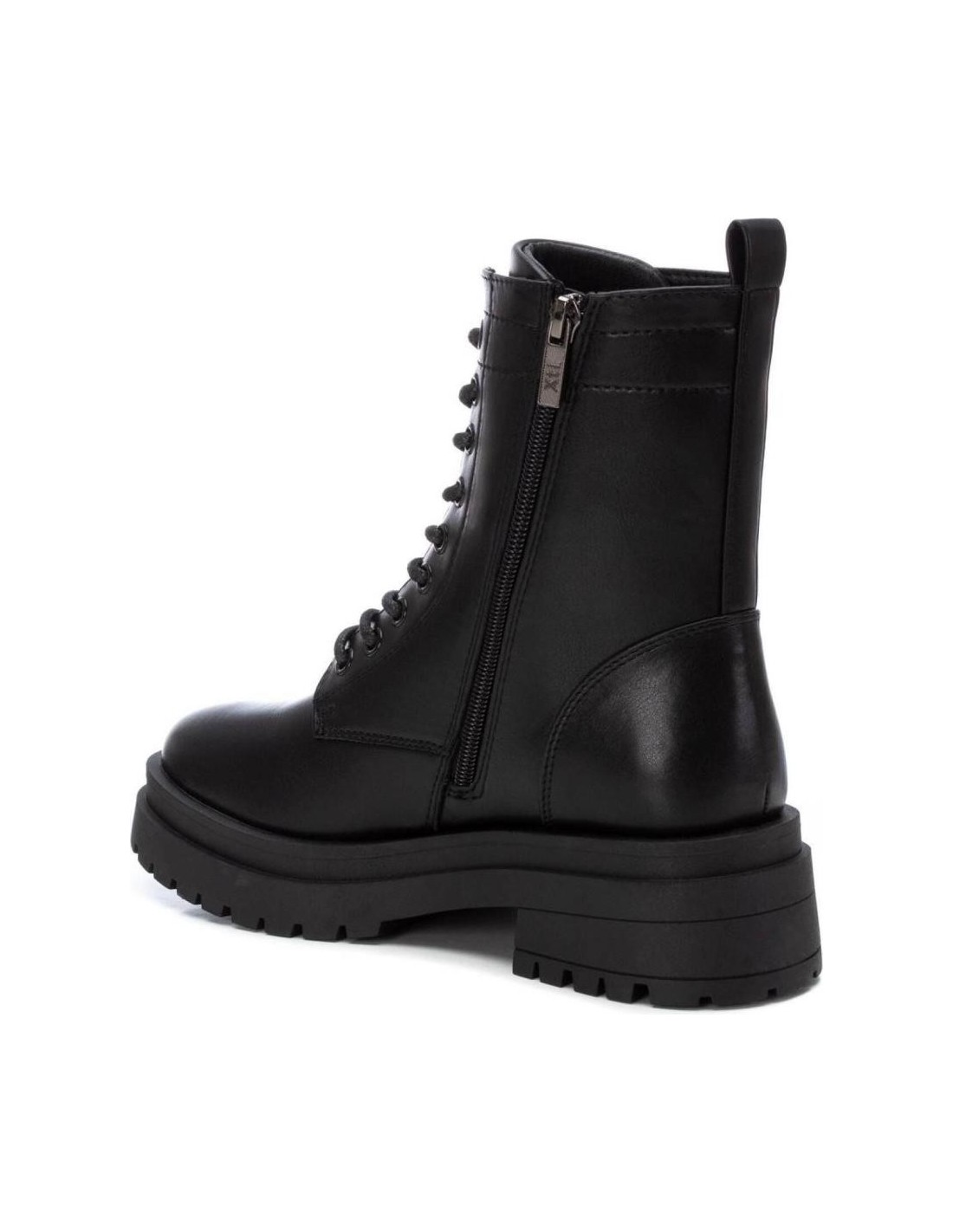 Botín de mujer, de la marca Xti. Fabricado en material que imita la piel. Cremallera lateral y cordones para un buen ajuste. Tirador trasero que facilita la puesta. Suela gruesa de goma antideslizante. Este modelo ha obtenido el certificado vegano por la organización mundial PETA (Organización de los derechos de los animales).