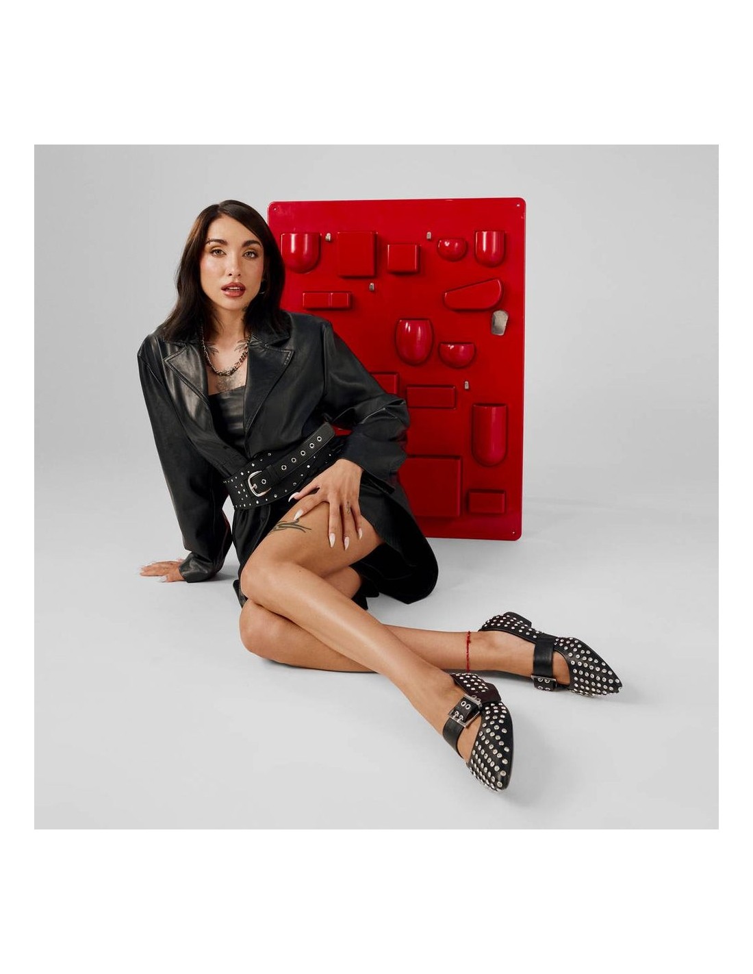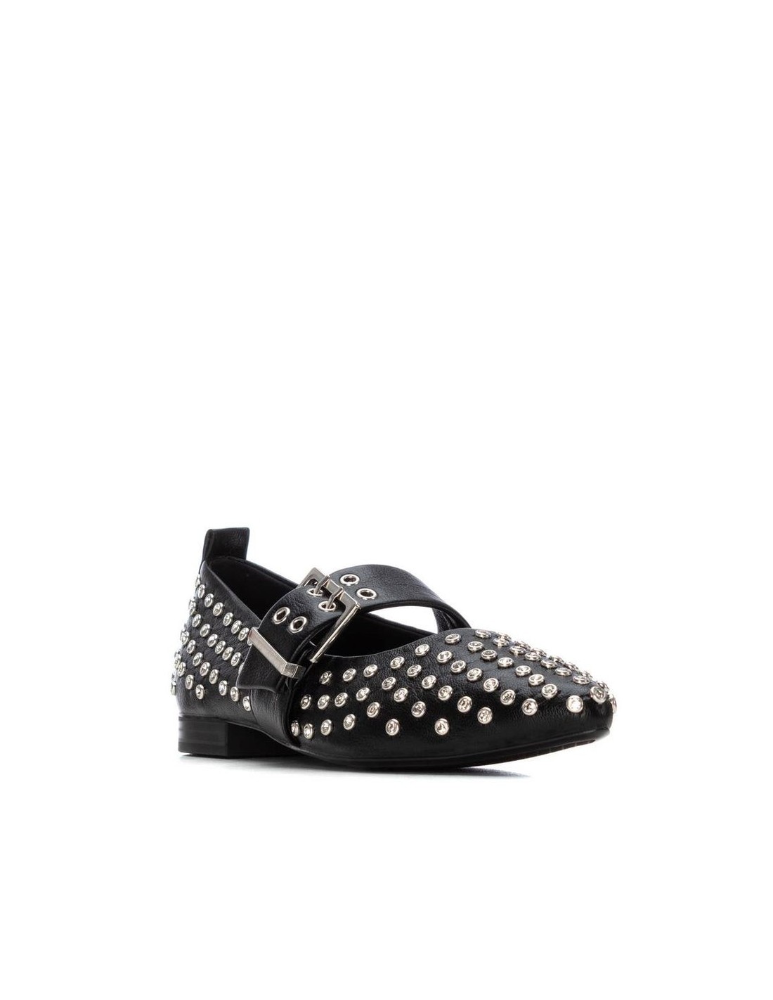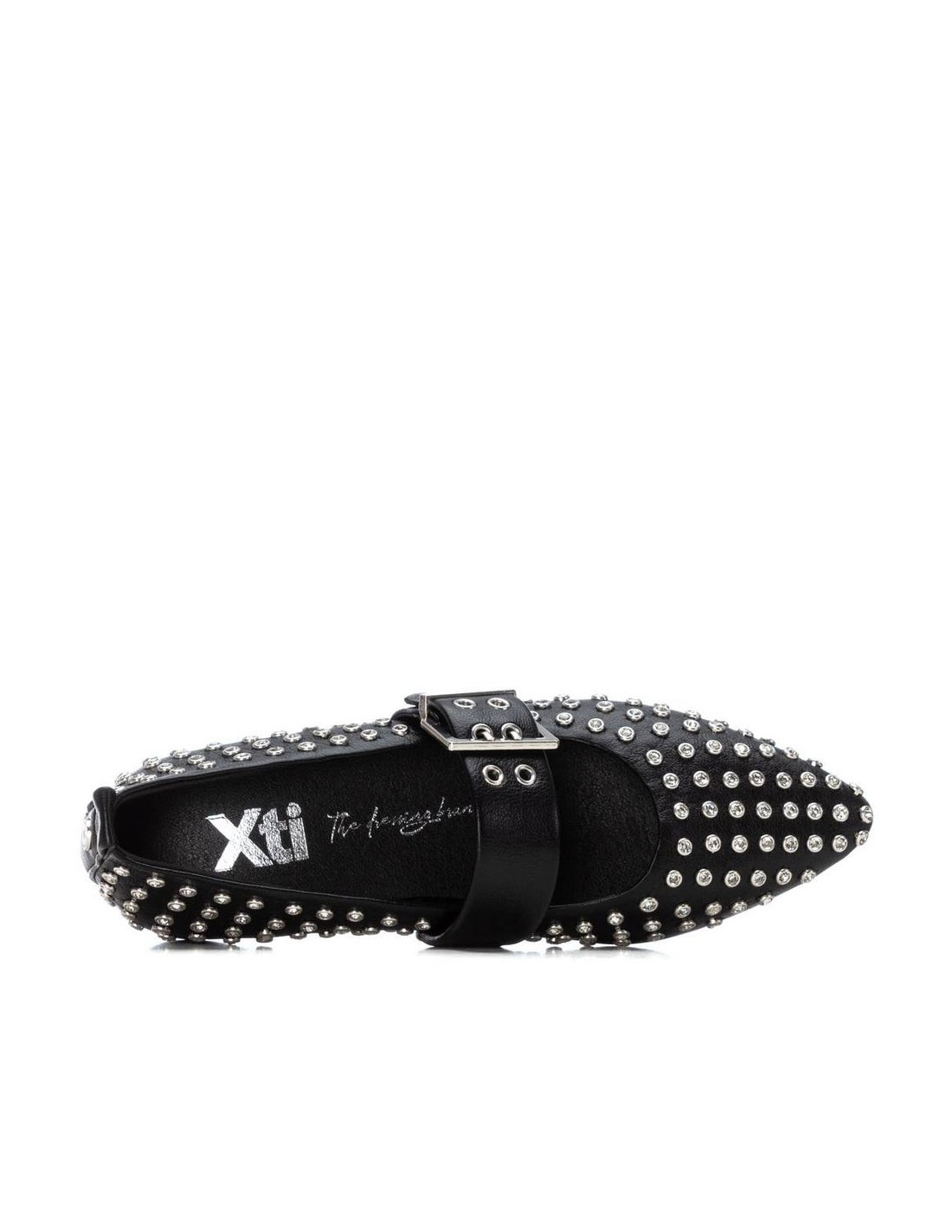 Bailarina de mujer, de la marca Xti. Fabricada en material que imita la piel decorada con tachas que incorporan cristales brillantes, añadiendo un toque de estilo y sofisticación. Cuenta con una hebilla ajustable para asegurar un ajuste perfecto. Un diseño elegante y moderno, ideal para aportar un toque de distinción y confort a tus looks. Suela de goma antideslizante. Este modelo ha obtenido el certificado vegano por la organización mundial PETA (Organización de los derechos de los animales).